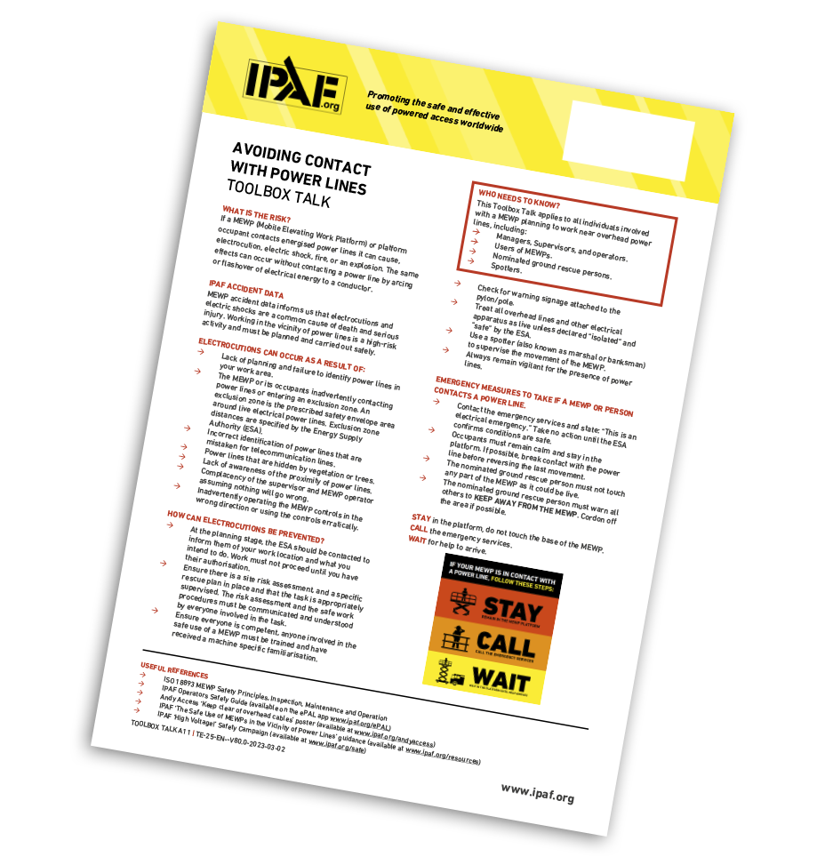IPAF provides a free, downloadable toolbox talk on avoiding power line contact, useful for site briefings and reinforcing the High Voltage! campaign.